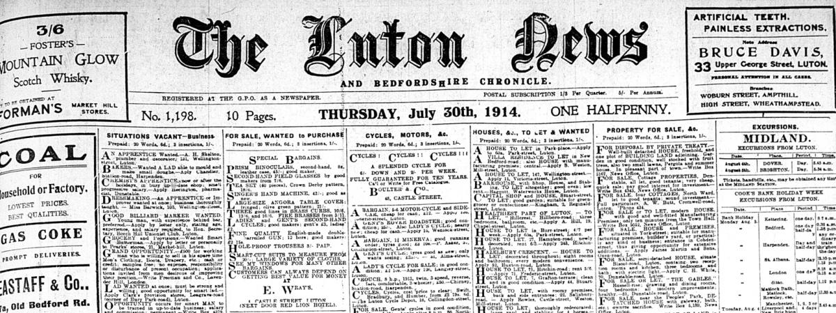 “War!” Not a screaming headline in the Luton News, more a whispered aside in the top left hand corner of page 8. Yes, it was reported that Austria had attacked Serbia ("Servia") and food prices in Vienna had rocketed. But British housewives were assured there would be no food shortages, though prices may be increased.