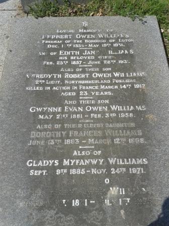 In 1911 he is a 16 year old school boy & living with his family at Farley Lynches, Farley Hill, Luton. His father is Deputy Mayor of the town & a building materials merchant, owning several properties in George Street. His sisters Dorothy Francis 27, Gladys Myfanwy 25 & 20 year old Judith Mary are also living at home. Meredyth's older brother Gwynne is a medical student & living away from home at a university student's house in St Pancras, London.