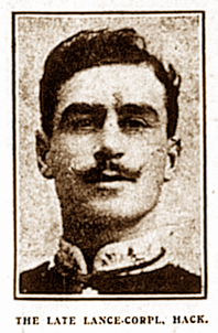 Lance Corporal Hack joined the Bedfordshire Regiment six years previously and had intended to serve 12 years with the colours. When war was declared he was with the 1st Battalion at Mullingar in Ireland and went from there straight to the front. The couple had not seen each other for nearly 14 months.