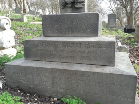 He was buried on Thursday, August 8th, in the Church Cemetery, Crawley Green Cemetery. An impressive parade of officers and men followed the coffin, which was draped with a Union Jack and carried on a gun carriage drawn by a team of black horses, from Wardown to the cemetery. Lieut Ramsey's own horse followed with his boots and spurs reversed.