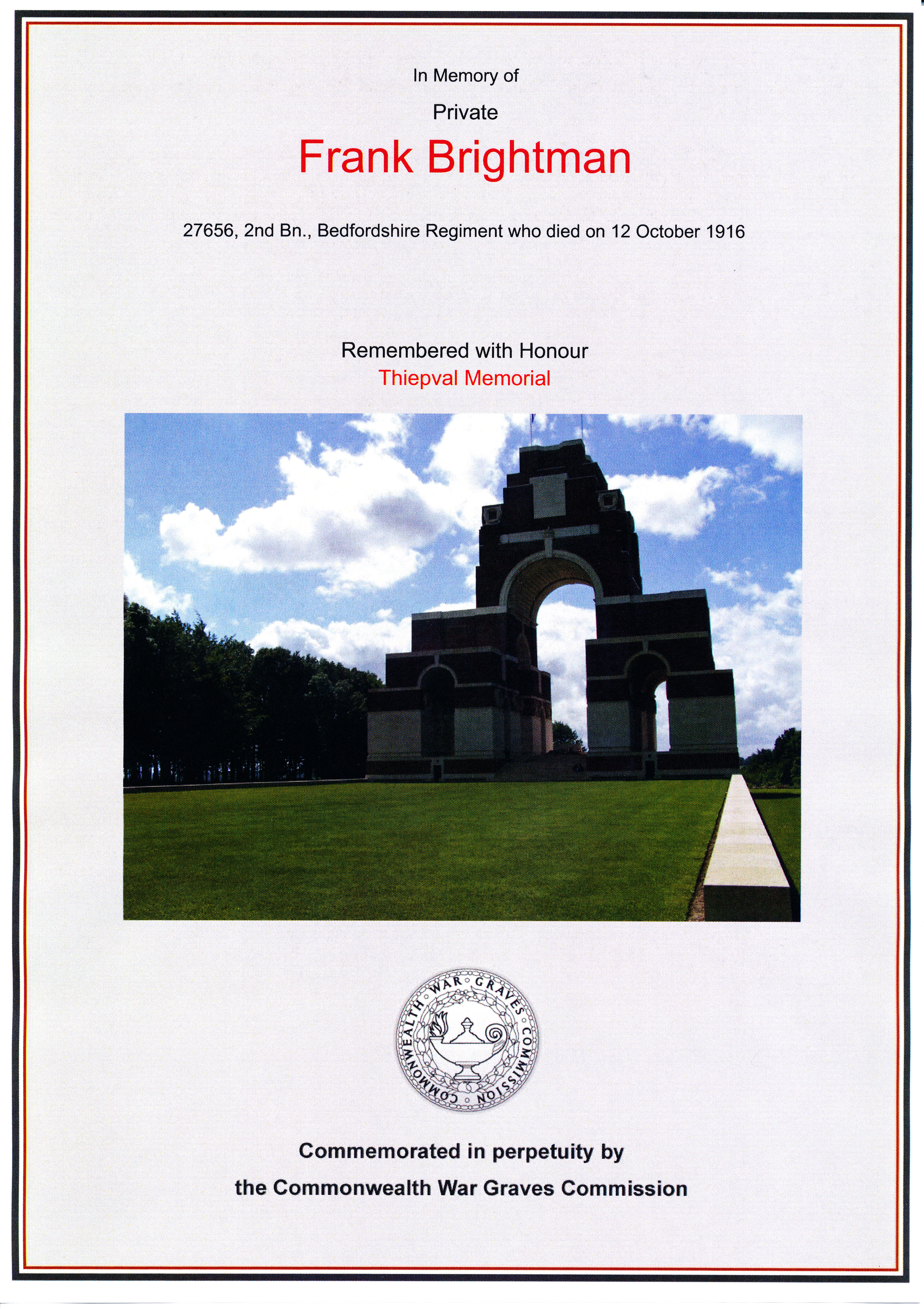 Frank Brightman was one of five sons of Samuel and Sarah Brightman of Great Bramingham who served on the Western Front. Tragically four of the five brothers were killed. Frank was reported Missing Presumed Killed in France on 12th Oct 1916, aged 32. He was the second son to be lost.