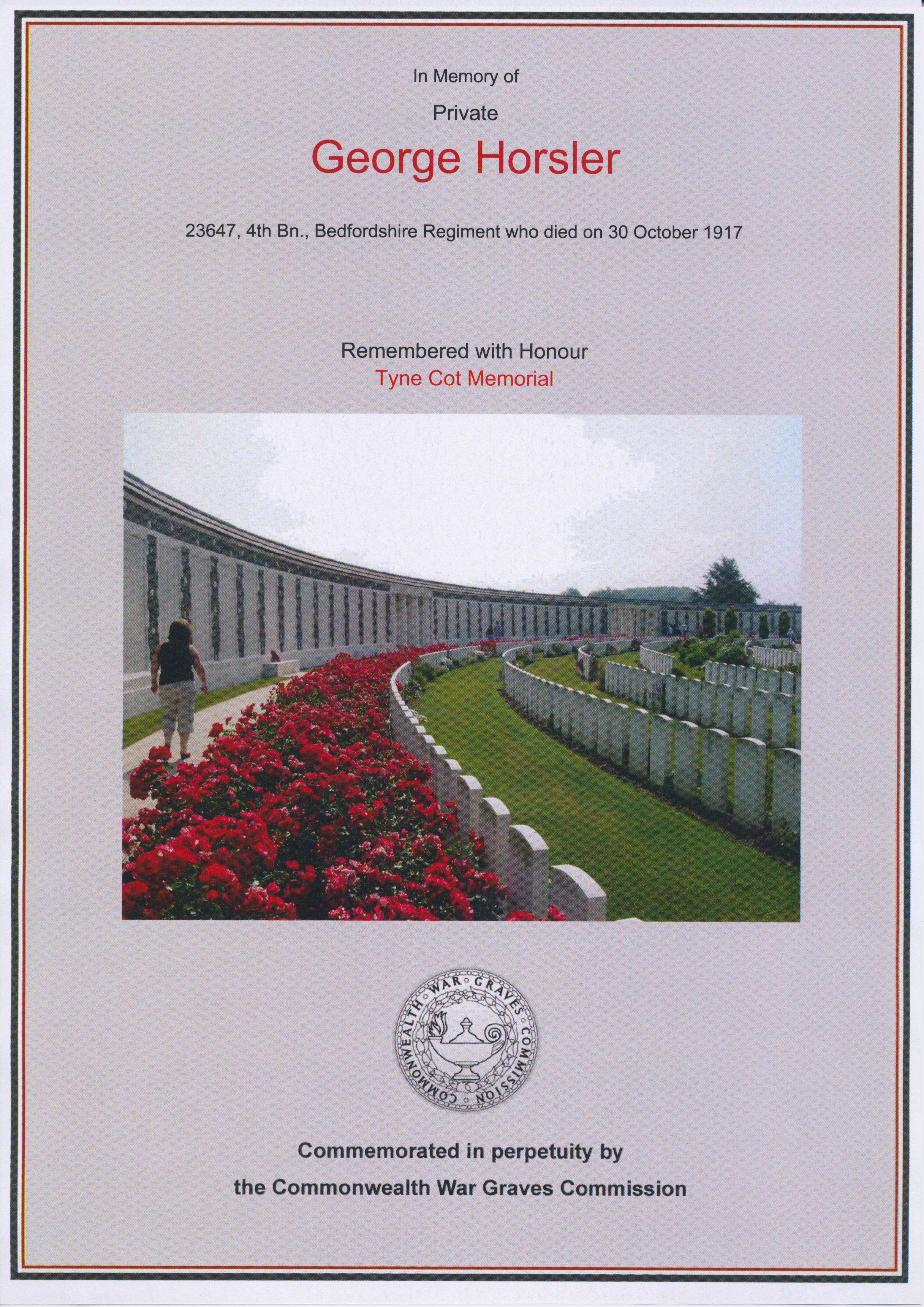 George was killed at Passchendaele in October 1917. He has no known grave and is remembered on the Tyne Cot Memorial near Ypres in Belgium. He is also named on the Sundon Village memorial in Bedfordshire.