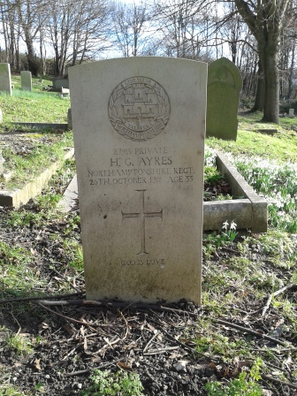 Pte Herbert George Ayres, 27915, 6th Battalion Northants Regiment, who died from double pneumonia on October 26th, 1918, was buried at Luton Church Cemetery in Crawley Green Road on October 31st. His body was borne on a gun carriage from his home at 360 Hitchin Road, Round Green, preceded by the band of the Royal Field Artillery from Biscot.