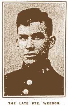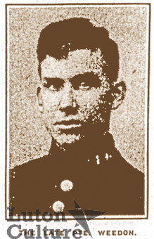 Pte Weedon, whose parents John and Sarah Ann lived at 53 Wimbourne Road, Luton, was a native of the town and lived here the major portion of his short life. He was only 22 years old. As a schoolboy he went to Chapel Street School until he was about 12 and then to Waller Street. For a time he was employed by Mr Treasure, of the furniture stores in Cheapside, and then went to the Diamond Foundry He left there and joined the Army for three years.