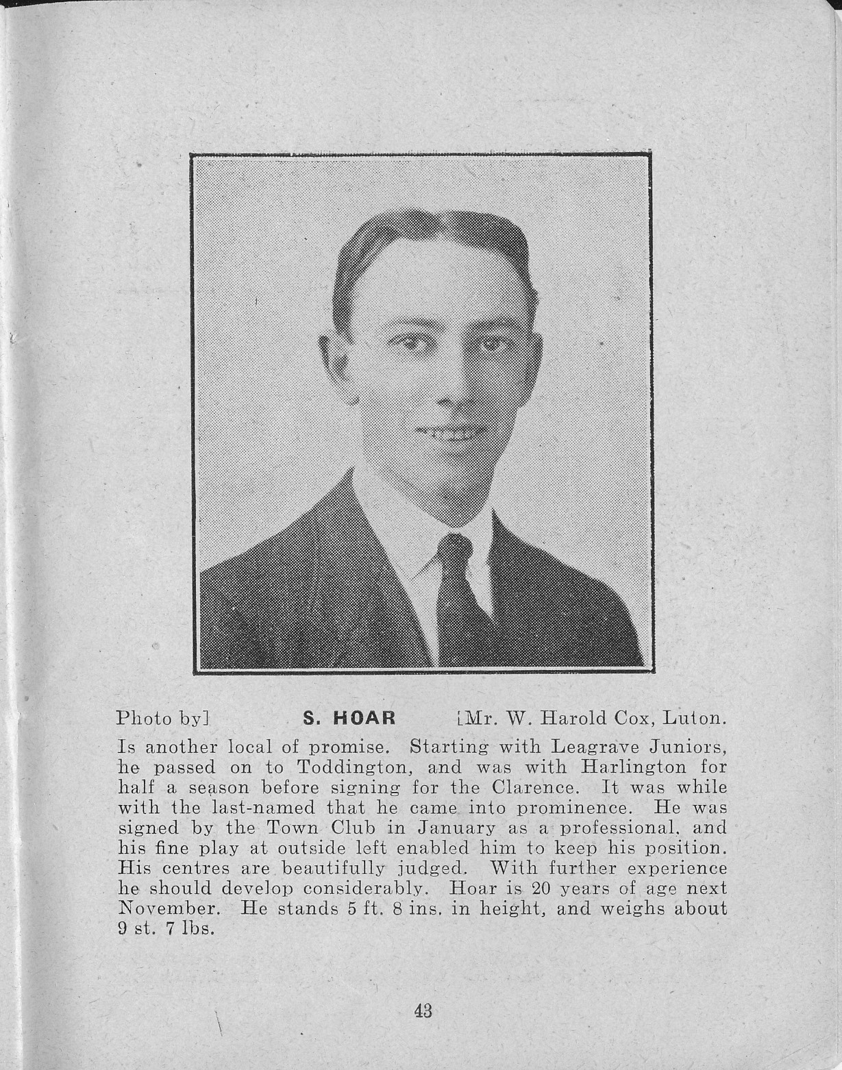 Sidney Hoar was a professional footballer for Luton Town FC who played for several local teams and the the Luton youth team before signing professionally in January 1914 aged 18. He served in the Bedford Regiment and the Royal Field Artillery and was gassed in August 1917 in France. He recovered and returned to play for Luton Town in 1919-20.