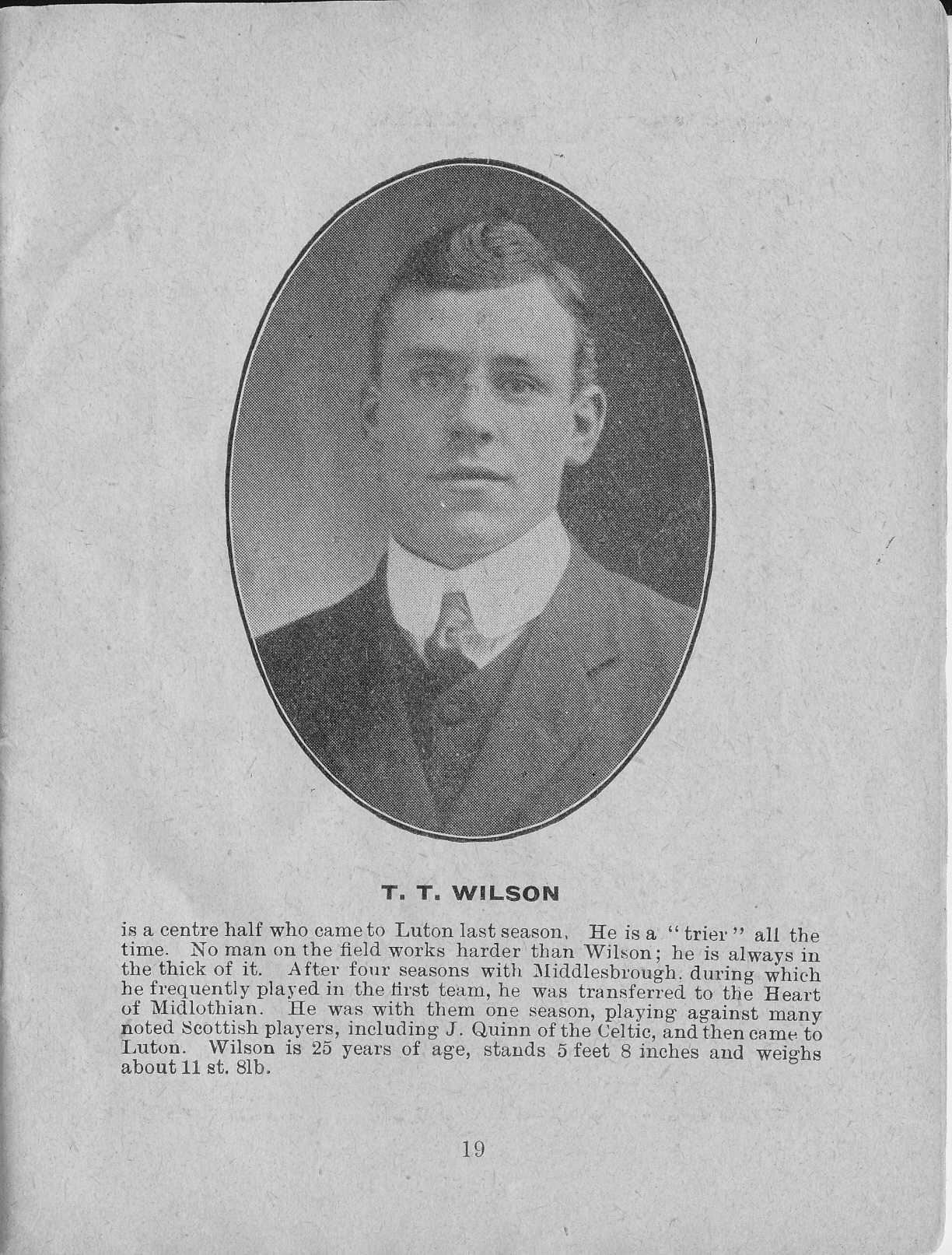 T T Wilson was a professional footballer with Luton Town FC when he enlisted in the Footballers' Battalion of the Middlesex Regiment at Kingsway, London on 16th December 1914 with his Luton team mates Wileman, Roe, Frith, Dunn and Simms.