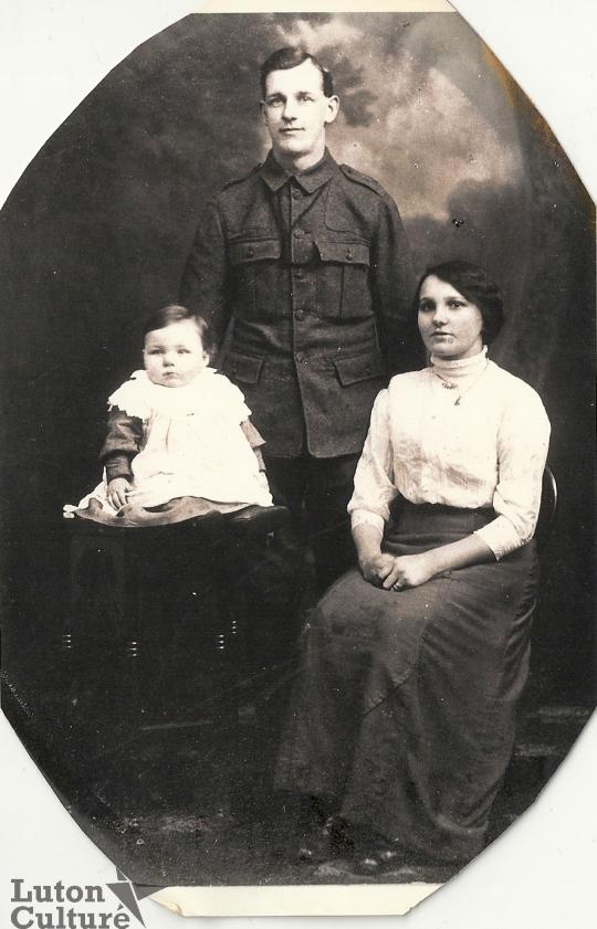 Matthew Millar Little was born in Lanarkshire, Scotland in 1889. At the outbreak of the First World War he was a coal miner but joined the Scottish Rifles (Reserves). This is a photograph taken in 1914, with Matthew's wife, Elizabeth, and eldest son, Alexander. Private Little's Great Granddaughter is a Lutonian and has worked for Luton Libraries for the past 12 years.
