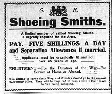 When war broke out he receives his call-up papers & enlists into the Royal Army Veterinary Corps as a Shoe Smith. He serves in France, Alexandria & Cairo. He also become an instructor at the School of Farriery in Romsey, Kent. During this time, he spends periods in hospital suffering from a stomach ulcer.