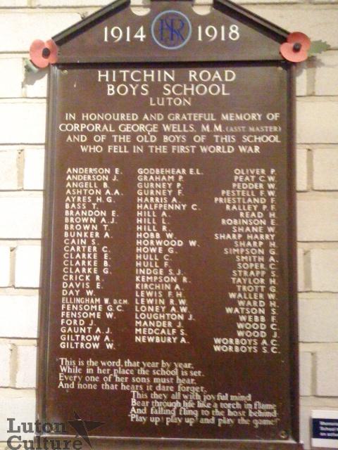 Hitchin Road Boys' School was created in 1883 by the Luton School Board. The memorial lists the names of one master and seventy four old boys "who fell in the First World War". When the school closed in 1967 it was donated to Luton Museum Service and is now on display at Stockwood Discovery Centre.