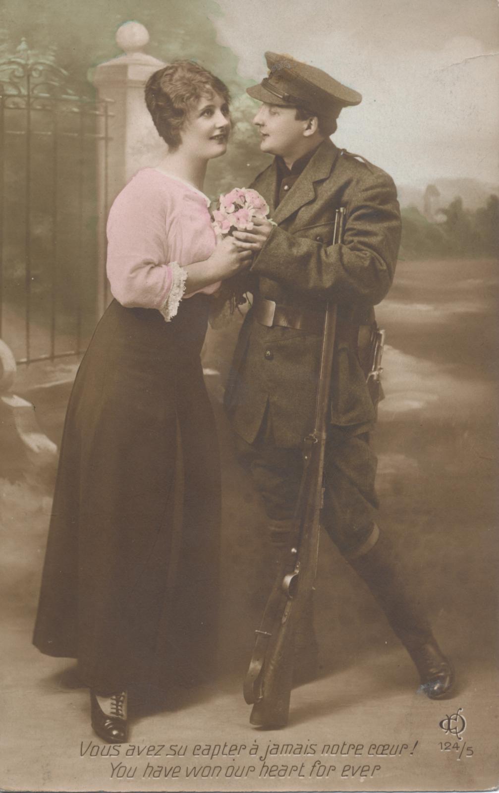 Sending, receiving and collecting picture postcards was very popular in the Great War. Many soldiers on active service on the Western Front would buy postcards in local shops as souvenirs or to send home to loved ones. The subject matter was usually romantic and sentimental.